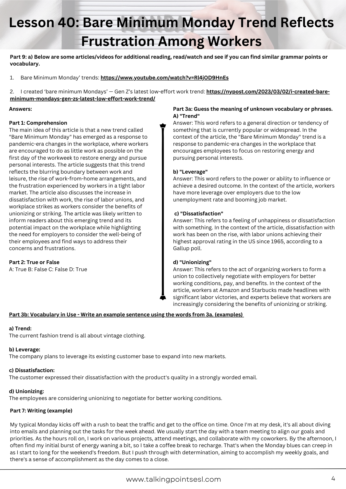 In this scenario, the students can be divided into pairs and discuss their thoughts on the "Bare Minimum Monday" trend. They can explore the pros and cons of the idea, share personal experiences, and discuss the potential long-term impacts on the workplace.