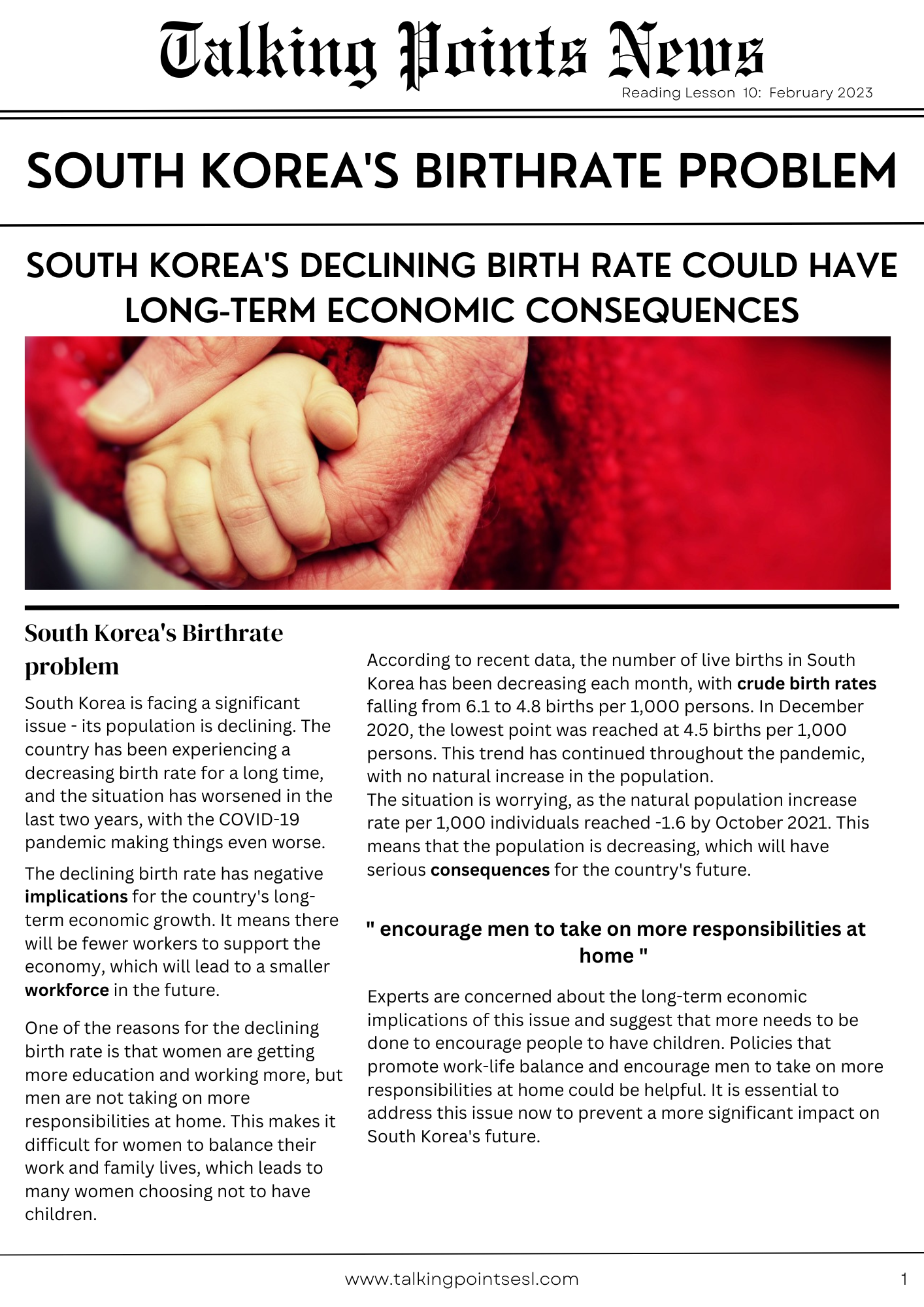 The Korean government have set up a special task force to help stop the falling birthrate and improve family life. Your team is part of a panel of experts that must come up with a 5 point plan to help promote family life and encourage couples to marry and have babies. Work in groups or pairs then come back together as a class and reach a consensus on the best 5 ideas.