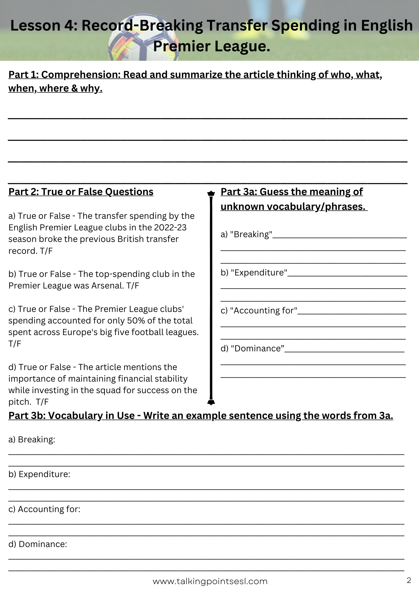 In groups think of the advantages and disadvantages of having so much money in football. Then come back as a class then reach a consensus on whether you think their should be more restrictions or caps on how much clubs can spend and how much players can earn.