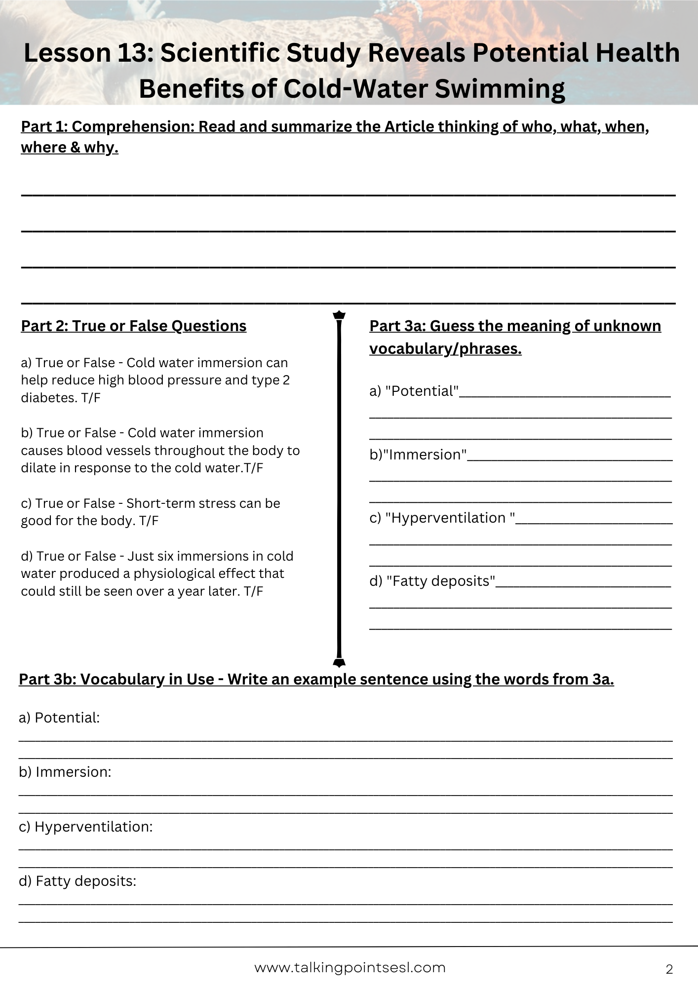 b) "Immersion" Answer: This means the state of being completely submerged in a liquid. In the context of the article, "cold water immersion" refers to the act of completely submerging oneself in cold water.