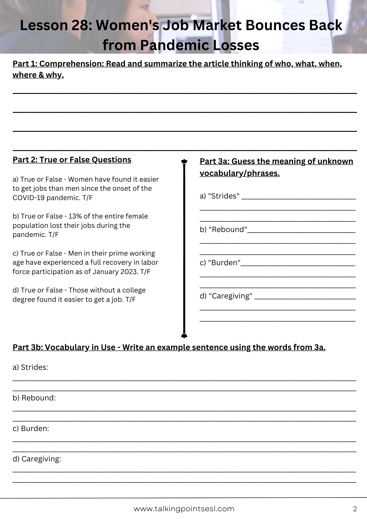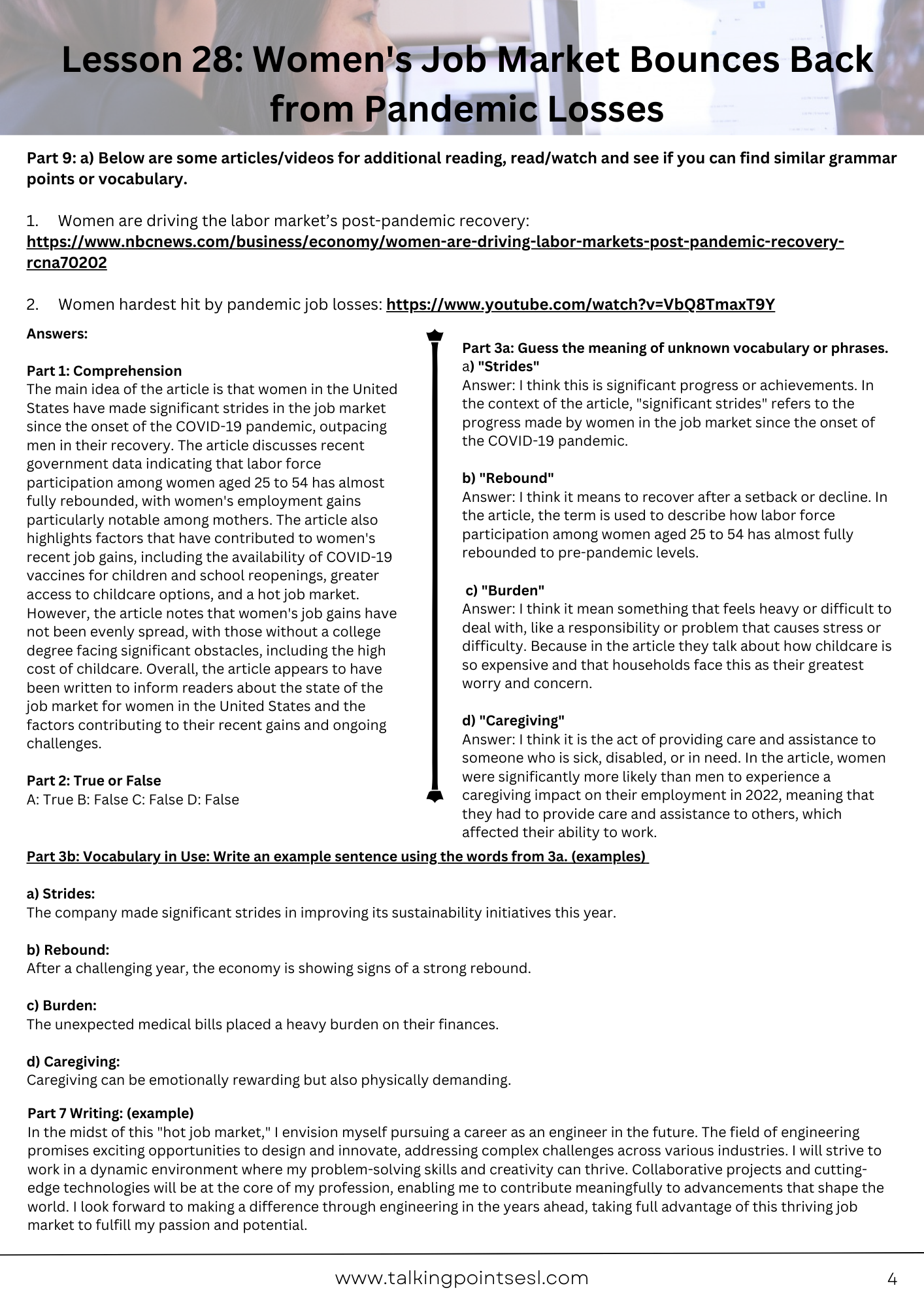 b) "Rebound" Answer: I think it means to recover after a setback or decline. In the article, the term is used to describe how labor force participation among women aged 25 to 54 has almost fully rebounded to pre-pandemic levels.